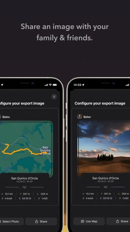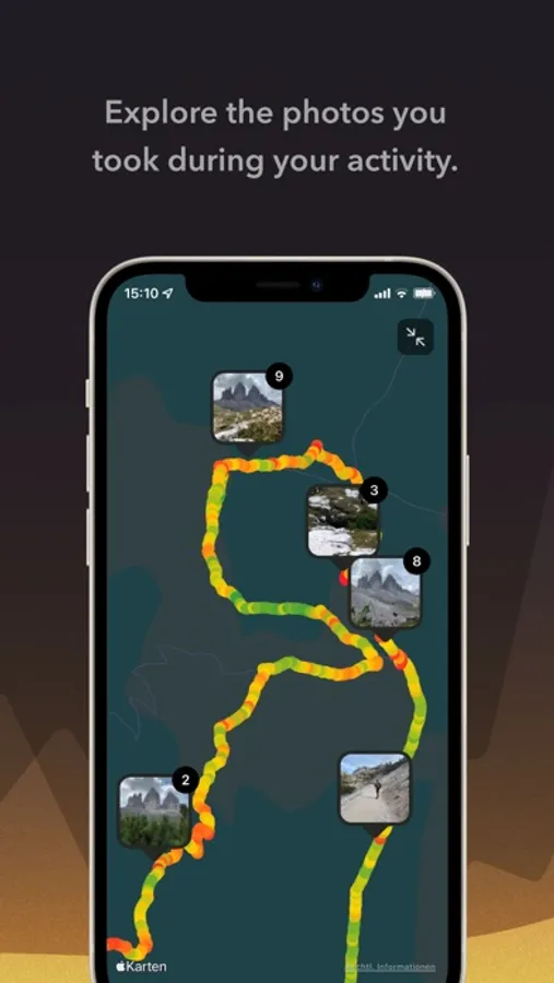 Baloc automatically displays all of your photos taken during your activities and locates them on the map. The best way the remember great trips or to come back to your favourite spots. Baloc also considers geotagged photos that have been taken with your camera and imported into Apple Photos.