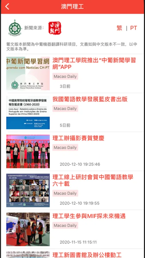"Chinese-Portuguese News Learning App" is a scientific research project of the "Engineering Research Centre of Applied Technology on Machine Translation and Artificial Intelligence, Ministry of Education" of the Macao Polytechnic University. The App provides learning resources that enable people from Macao, China, and other countries to learn Portuguese, and people from Portuguese-speaking countries to learn Chinese. The content of the news column is divided into "local news", "China news" and "world news". The Chinese news source from Macao Daily.