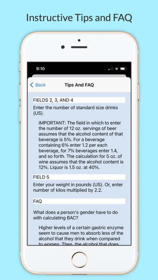 This app utilizes a method that has long been used by medical and legal professionals to determine approximate Blood Alcohol Content (BAC).