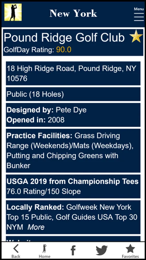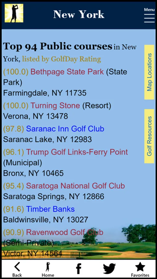 GolfDay New York includes 600 golf courses in the state of New York, with a GolfDay Rating and proximity search making it easy to find a great track near you or where you plan to be. Listings also include rates, booking links, course detail, golf league and junior golf information, mapping/directions and local weather. Don’t waste your valuable time at a Dog Track!