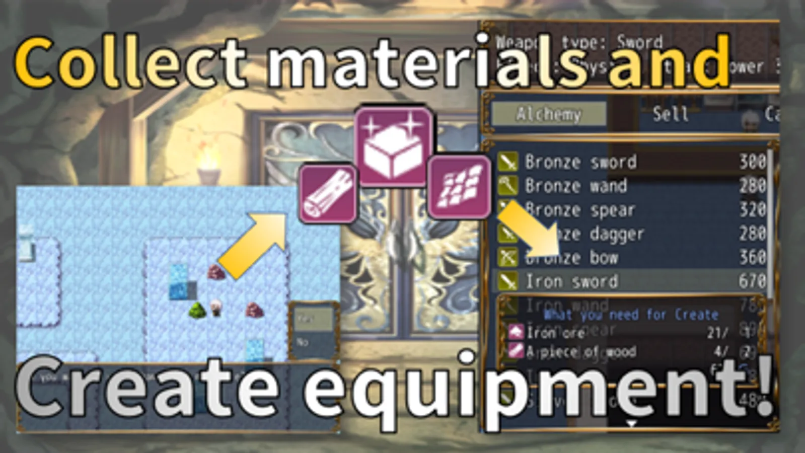 You can obtain materials for craft by mining ore in the dungeon, subduing monsters, and picking up items. Let's collect materials and create powerful weapons and items.