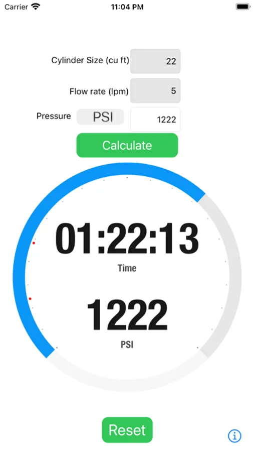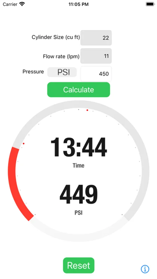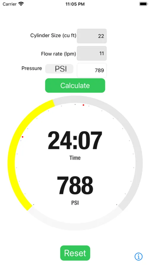 The Pressure and Time app is currently designed for oxygen cylinders whose normal oxygen capacity is 1850 psi when full, but the user can enter as high as 2000 psi for gas expansion.