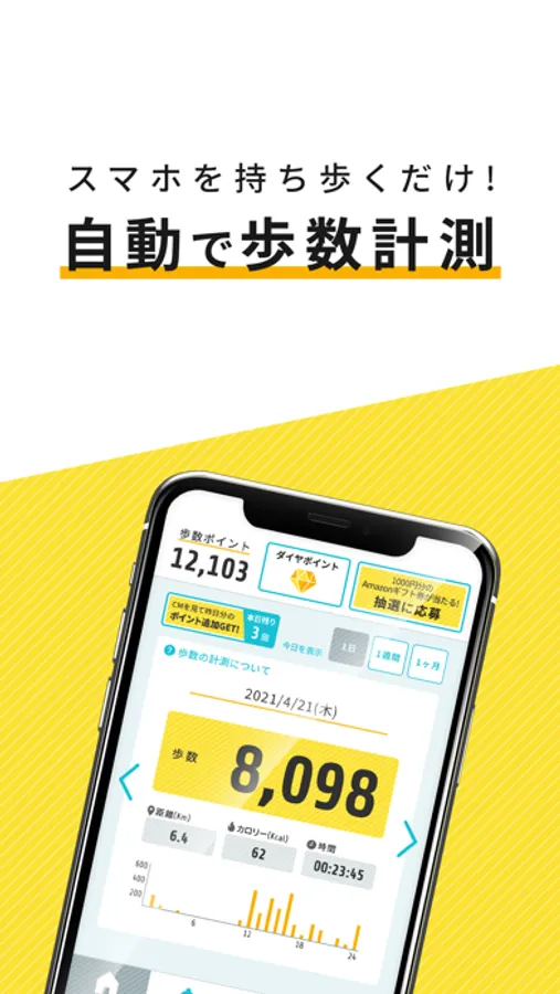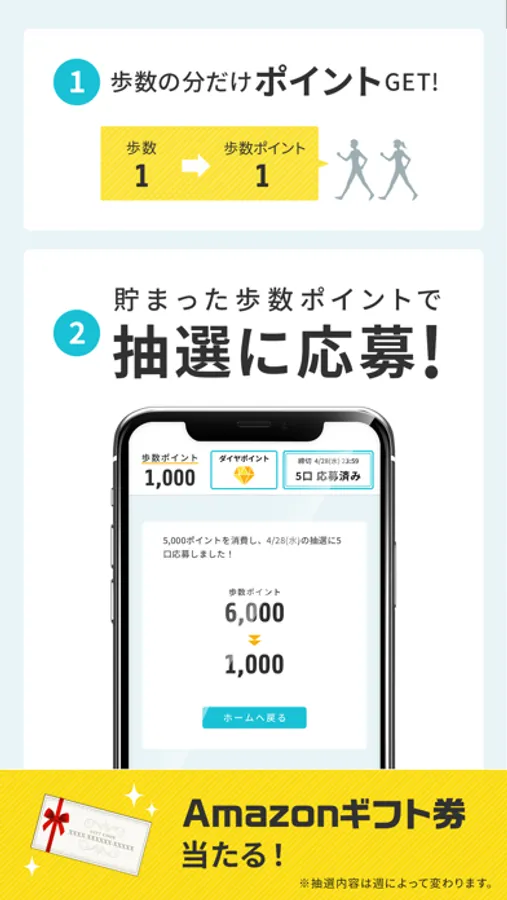 ・歩いて貯めたポイントでAmazonギフト券が当たる抽選に応募できるポイ活アプリです。