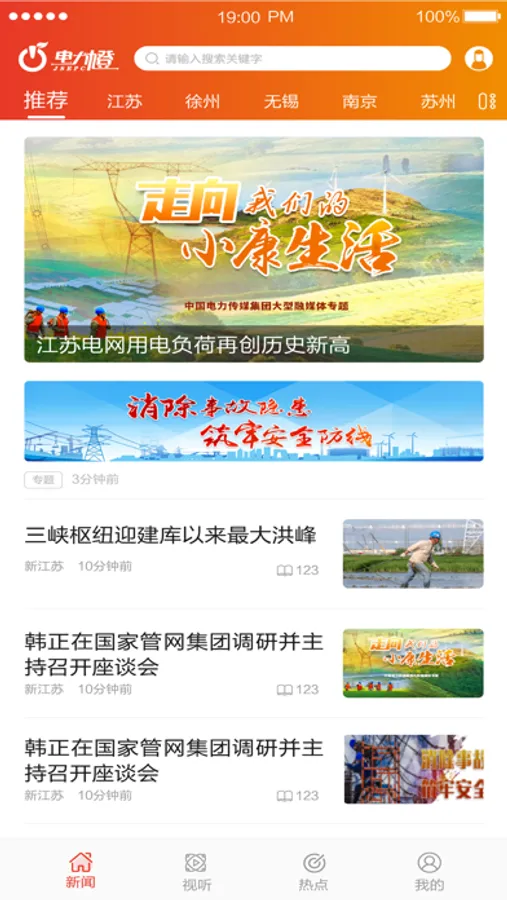 “电力橙”APP为江苏苏电提供了一个整合苏电新闻、直播、拍客、美图等资讯内容的平台。用户下载“电力橙”APP,要开即显示首页,首页分为新闻、视听、热点和我的四个模块。
