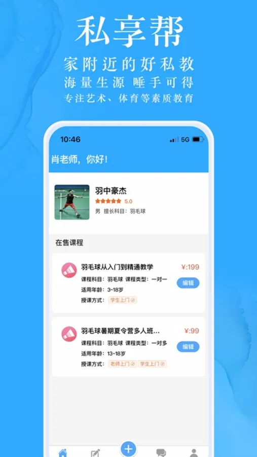 私享帮APP是一款专为2~18岁想要学习艺术、体育的人群提供一个查找附近能提供一对一上门授课服务的优质私教老师的第三方服务平台,此为老师版。