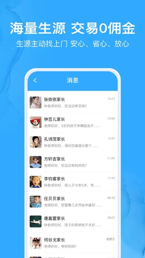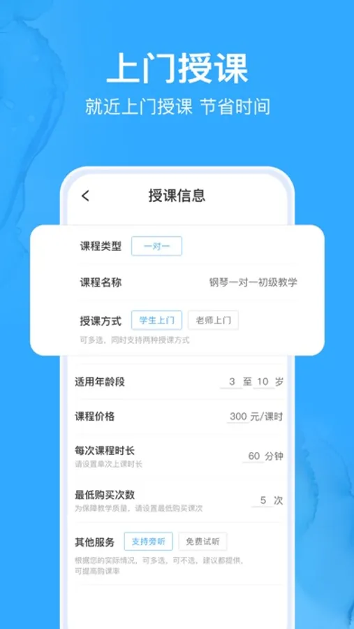 老师可以通过本APP轻松招揽您附近的目标生源并能和学员或家长在线联系沟通,本APP支持学员直接下单购买课程,交易0佣金。您也可以在本平台兼职教学,利用闲暇时间创收,就近上门授课,节省您和学员的宝贵时间。