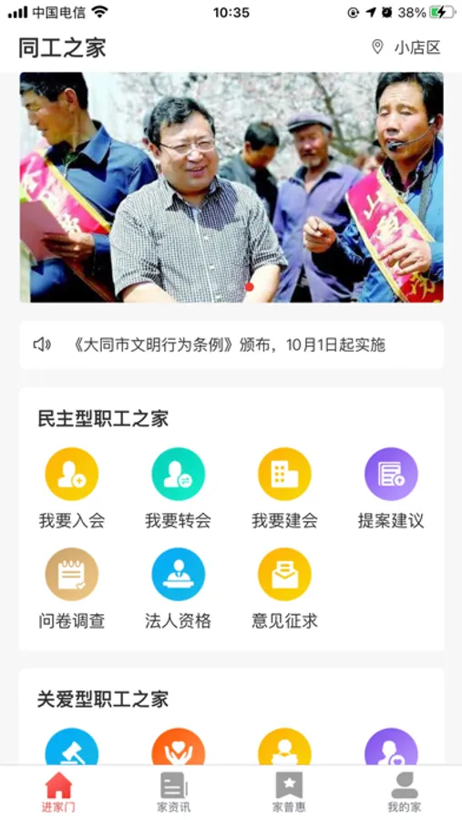 同工之家 APP 是大同市总工会推出的移动服务端,以用心服务大同职工为导向,为职工提供文体活动、教育培训、普惠服务、法律咨询、帮扶救助、新闻阅读、婚恋交友等实实在在的服务项目,为大同职工群众打造良好的网上职工之家,享受“指尖上工会”的方便、快捷、高效的服务。