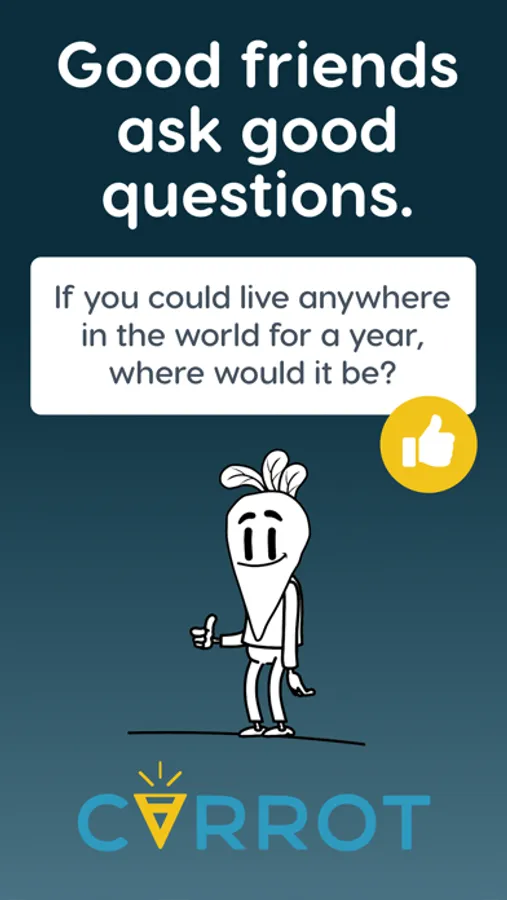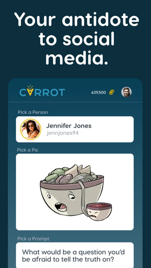 Tired of social media? Dig deeper. Carrot allows you to connect with friends authentically, at any time, and earn digital currency while you do it! Answer a new question each day and earn EVERY time. Entice friends to answer your clever questions and reward them with coins you’ve earned.