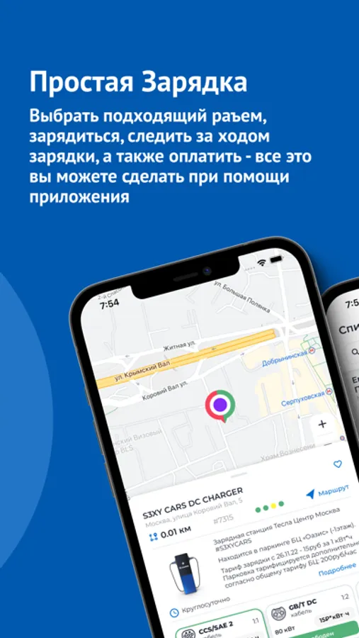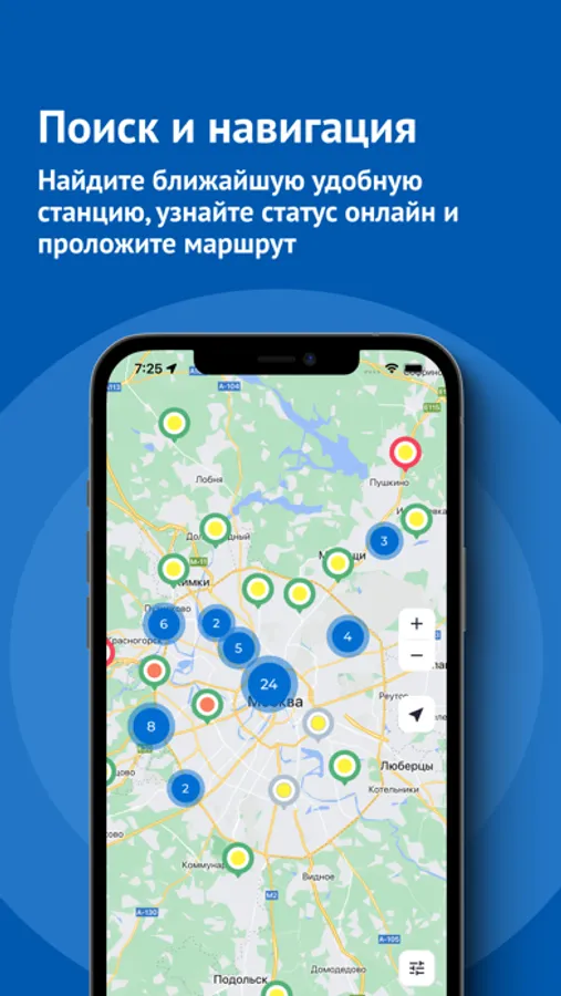 ▸ подскажет, где находятся электрические зарядные станции (ЭЗС) вокруг Вас и статус их доступности в режиме онлайн;