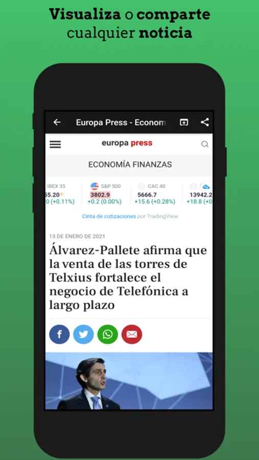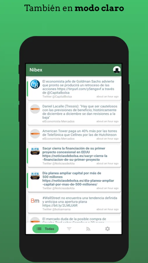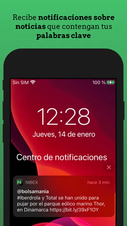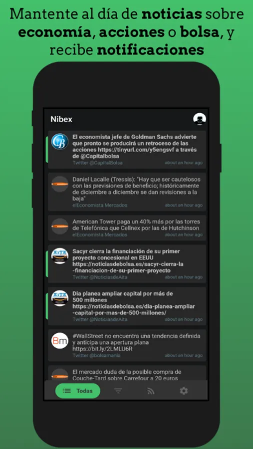 No necesitas tener ningún widget de noticias, la aplicación te enviará notificaciones en tiempo real, manteniéndote informado de todas las noticias financieras del mercado español o la bolsa (ibex 35), siempre teniendo en cuenta tus intereses definidos en las palabras clave. Empieza a recibir notificaciones hoy ahorrándote tiempo en la búsqueda de noticias interesantes.