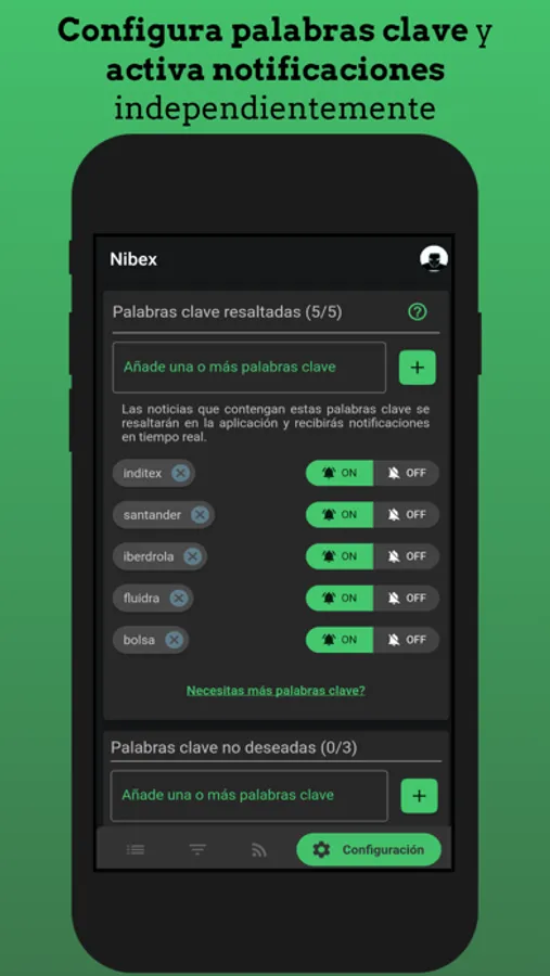 Por defecto, añadimos las palabras clave 'inditex', 'santander' e 'iberdrola' para facilitar el uso de la aplicación, pero puedes añadir cualquier otro término que se te ocurra como 'telefónica resultados', 'bbva beneficios', 'economía española', 'amadeus', 'arcelormittal', 'repsol', 'aena', 'naturgy', 'caixabank', 'endesa', 'iag', 'ferrovial', 'grifols', 'acs', 'bankia', 'red eléctrica'...