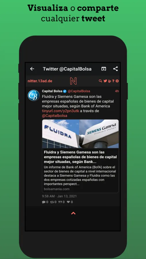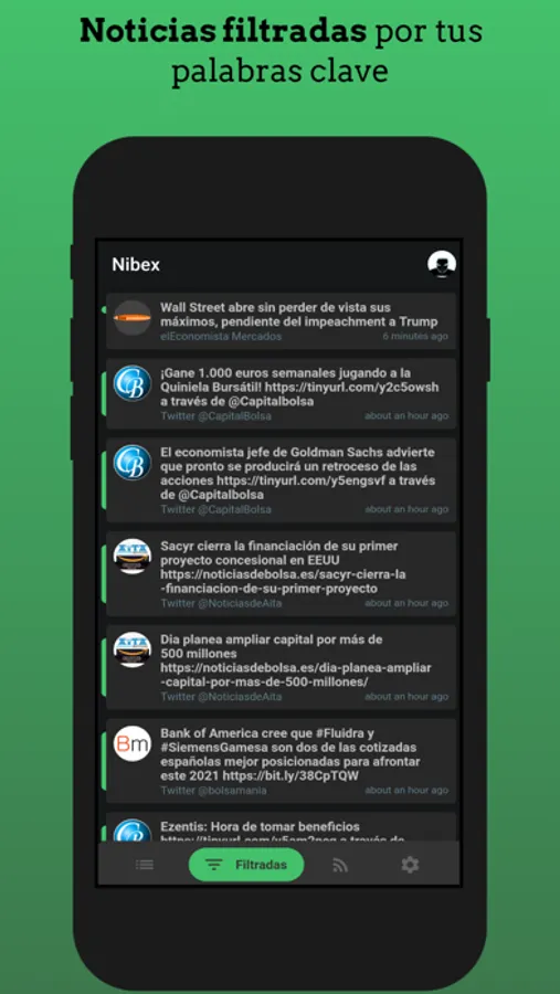 ¿Por qué usar esta aplicación en lugar de twitter o cualquier otro agregador de noticias? Sencillo, porque las personas influyentes o analistas de twitter pueden hablar de muchos temas diferentes que pueden no interesarte. Al configurar palabras clave, sólo recibirás notificaciones de noticias que contengan esas palabras.