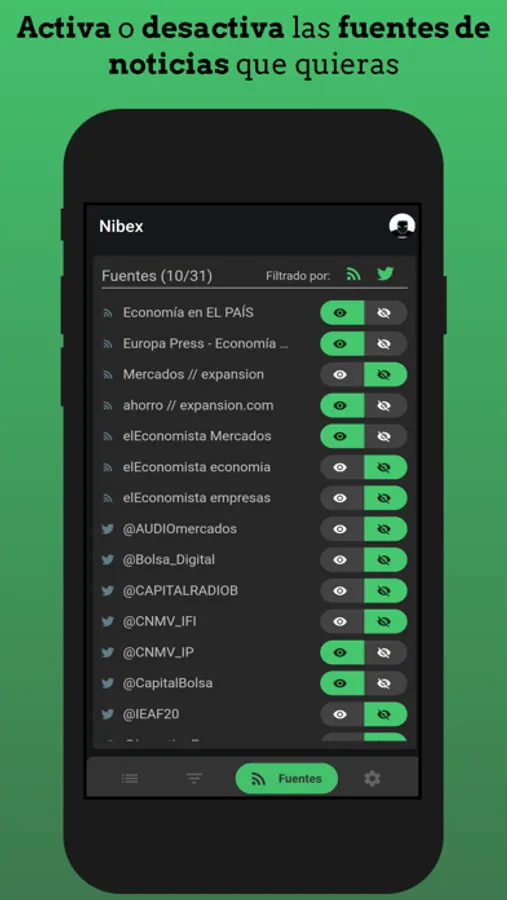 Más de 30 proveedores de noticias diferentes, incluyendo webs de noticias, analistas y usuarios influyentes de twitter relacionados con la economía española.