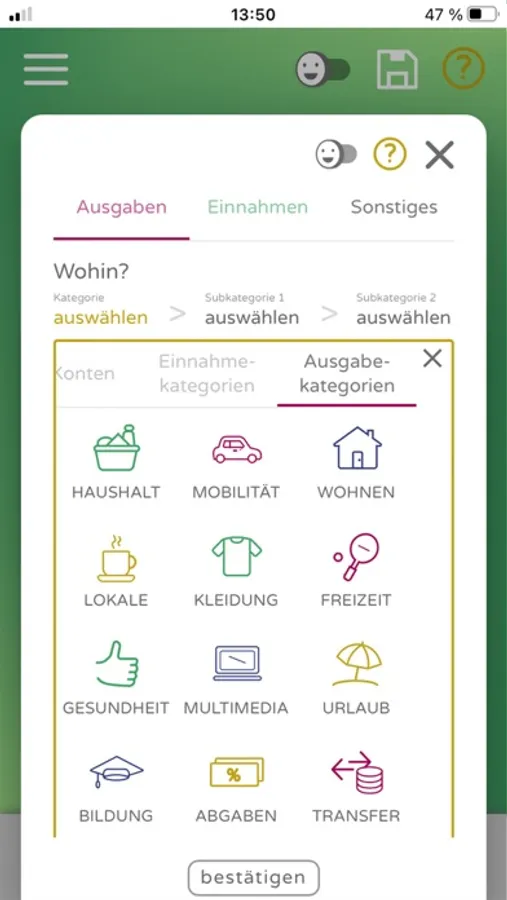 Einfach Geldbeträge und Bezeichnungen einzelner Einnahmen und Ausgaben kategorisieren und immer den Überblick behalten! Wiederkehrende Zahlungen können auch erfasst und automatisch eingetragen werden.