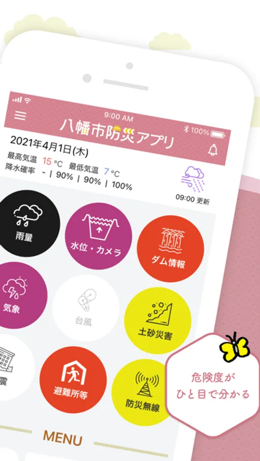 本アプリは気温、降水確率などの天気予報をはじめ、雨雲レーダーの表示が可能となっており災害時だけでなく普段の生活でも利用できます。