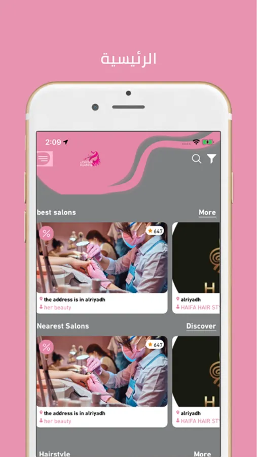 تطبيق سعودي متميز يجمع نخبة من الصالونات ودور التزيين في المملكة العربية السعودية ليسهل الوصول إليها وحجز الأوقات المناسبة والدفع الإلكتروني باحترافية وسرعة ومرونة عالية حفاظاً على وقت عملائنا المتميزين.