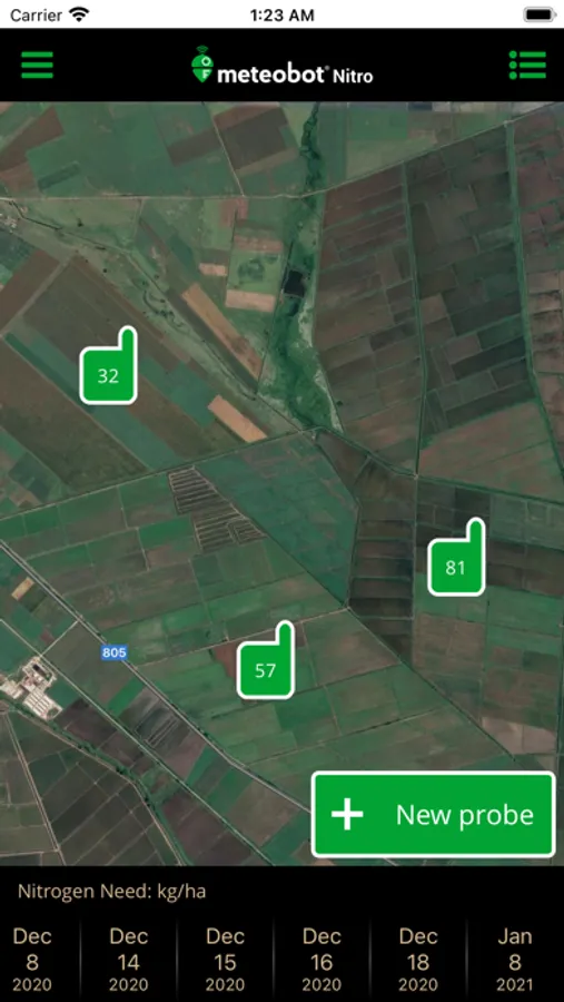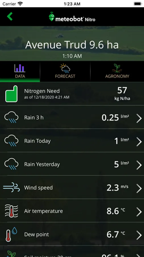 On the basis of chlorophyll content, rainfall, soil moisture, soil temperature, air temperature, soil type and content, weather forecast and wheat variety, you get a customized nitrogen fertilizer recommendation from the Meteobot® Nitro mobile app.