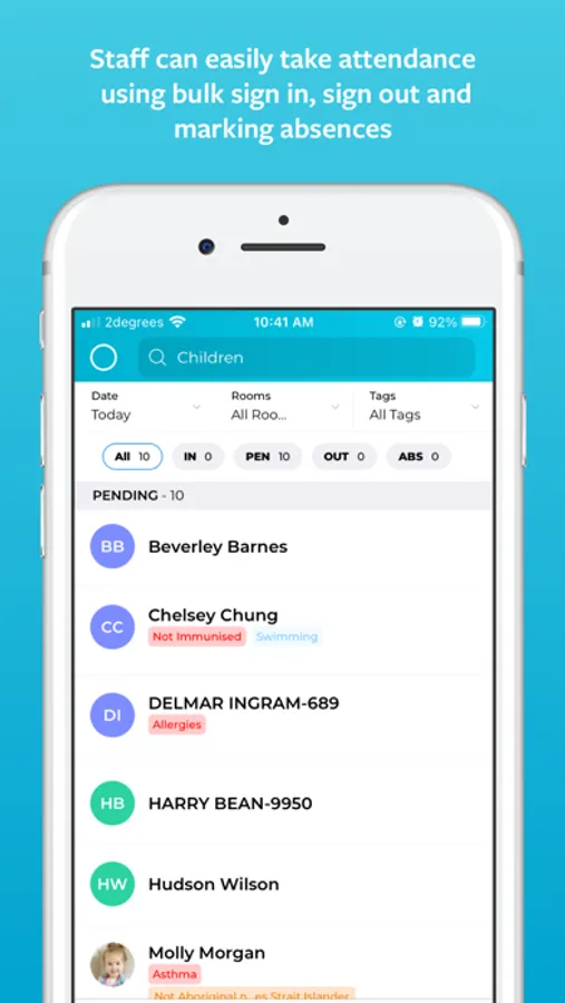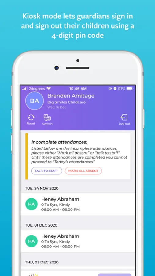 A digital attendance system performs daily audit logs, and can trace sign-in and sign-out times, right down to the very second. Using just a mobile number and PIN number, families can quickly check-in their children using their own device. For simple attendance tracking, you will love being able to record and manage absence records, with the ability to also add notes. When parents use the sign-in app, you can provide them with billing alerts and announcements. No more having to call, email or find them at drop off and pick up times!