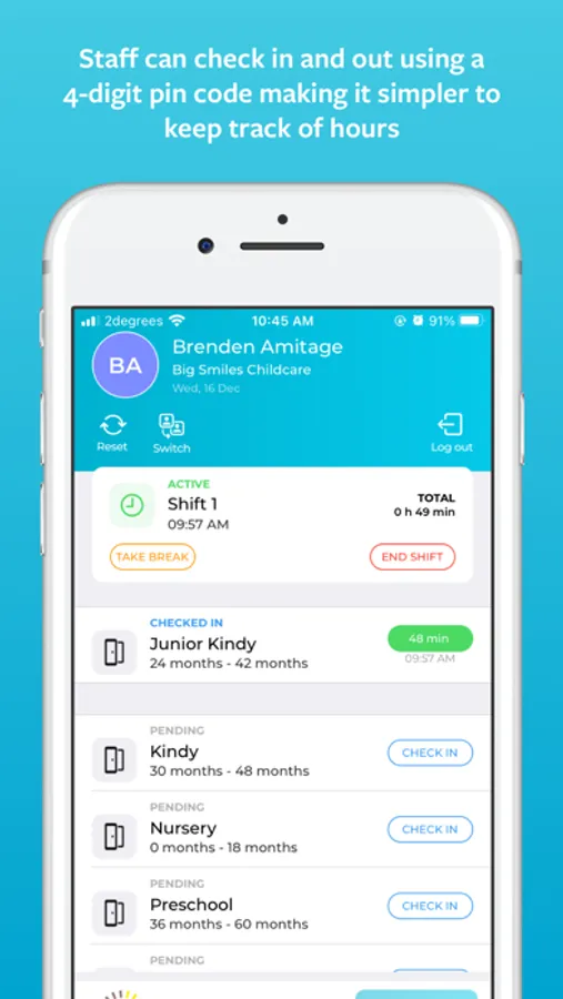 The kiosk feature can also be used for staff to sign in and out with each day. No more printing off, and gathering mountains of paper each year. Say goodbye to processing timesheets and payroll. Using the kiosk feature for staff to sign-in and out, means that staff breaks and total hours worked are automatically calculated. You can also easily export these as reports for payroll systems.