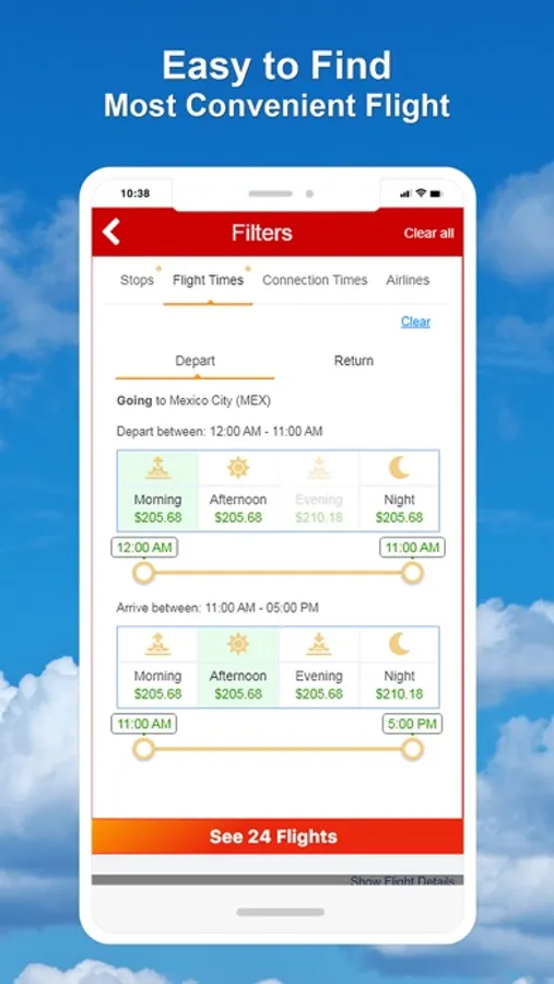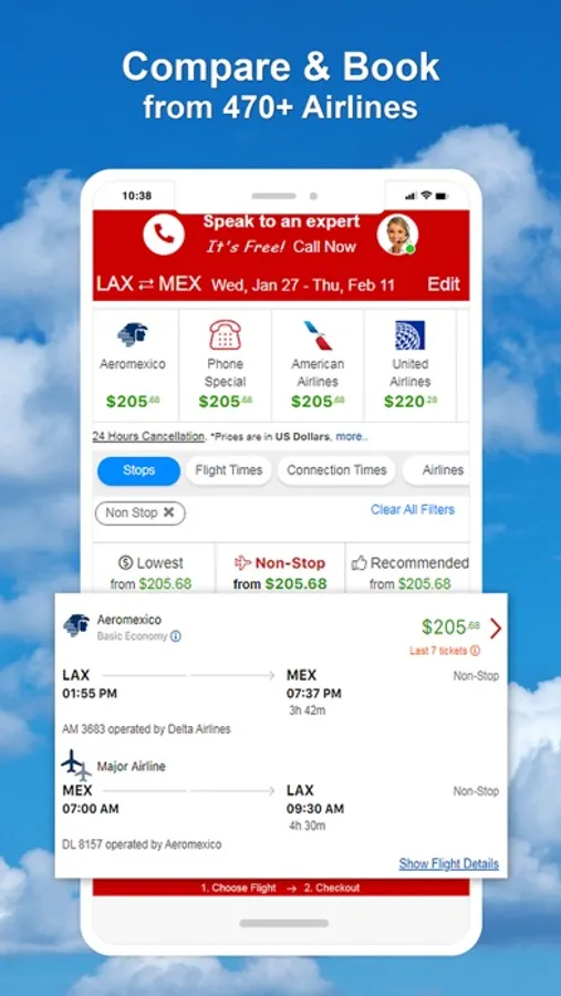 - State of the art search filter that sorts flights that fit your price range & meet your preference for airport, airlines, number of stops, and flight timings.