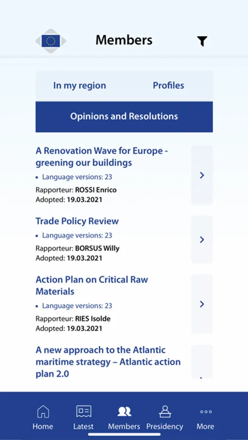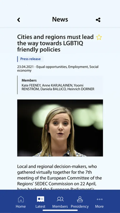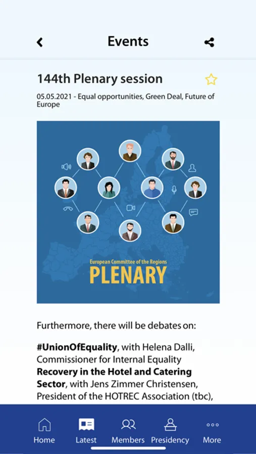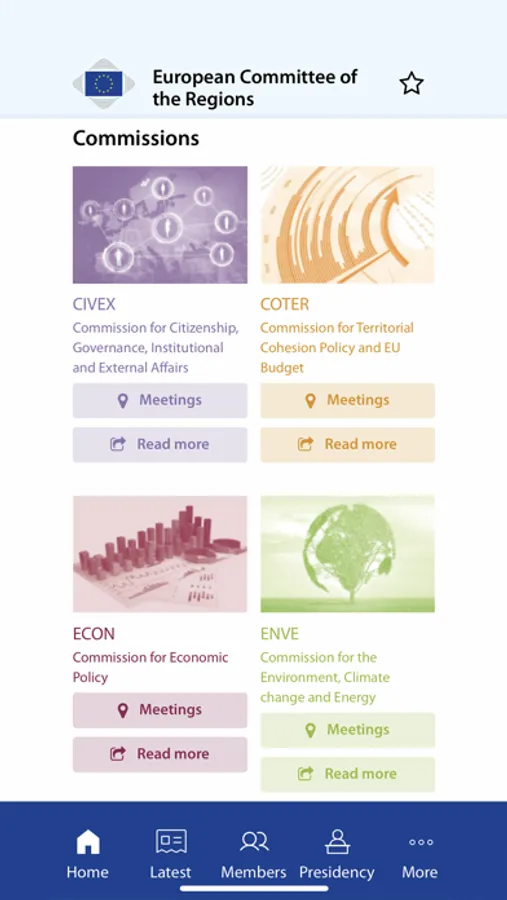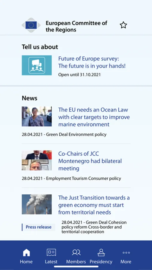 The mobile app of the European Committee of the Regions (CoR) brings you real-time notifications about news, events and opinions on your preferred topics. Save your favourite items and share contents as you go from meeting to meeting via social media and other channels.