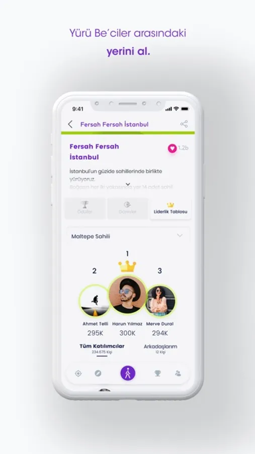 Yürü Be İstanbul sayesinde adım sayısını takip edebilir, görevlere katılabilir, rotaları takip edebilir, bölgendeki Yürü Be’ciler ile liderlik yarışına girebilir, en çok da bol bol kazanabilirsin. Yürü Be İstanbul ile attığın her adım sana sağlık katarken bir yandan da eğlenebilirsin.