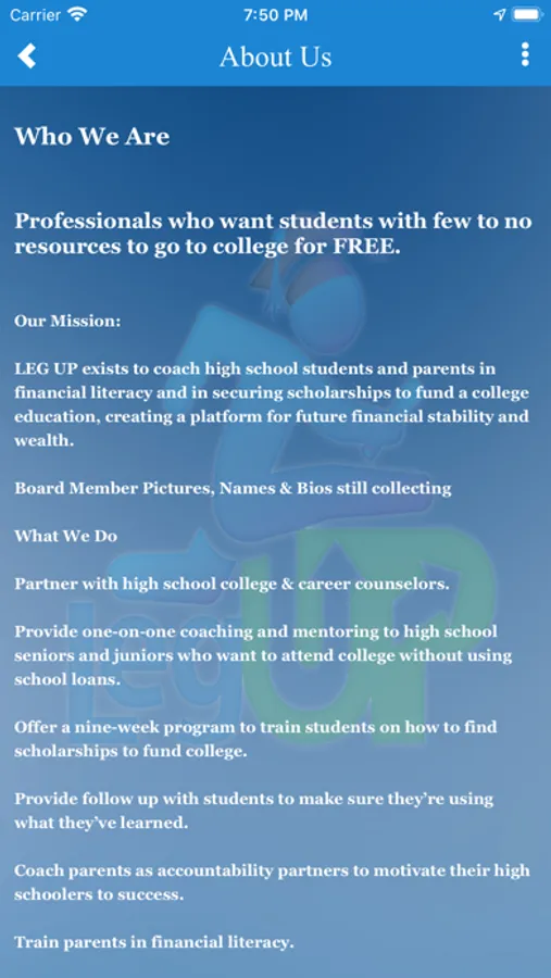 LEG UP exists to coach high school students and parents in financial literacy and in securing scholarships to fund a college education, creating a platform for future financial stability and wealth.