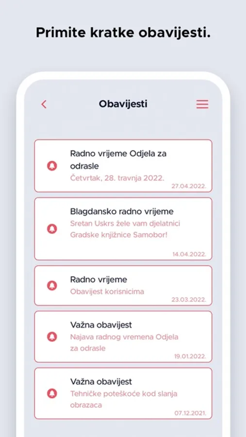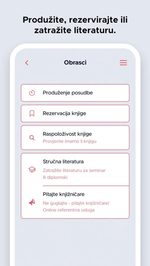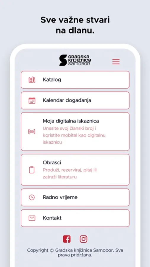 Aplikacija je namijenjena korisnicima Gradske knjižnice Samobor uz pomoć koje korisnici mogu pretražiti e-katalog knjižnice, pregledati kalendar događanja u knjižnici, generirati svoj korisnički broj u barkod, produžiti posudbu građe, rezervirati građu, provjeriti da li knjižnica posjeduje primjerak neke građe ili zatražiti literaturu za seminarski rad. Unutar aplikacije nalaze se i Radno vrijeme knjižnice, odgovori na Česta pitanja, kontakt podaci svih odjela i službi knjižnice te poveznice na društvene mreže.