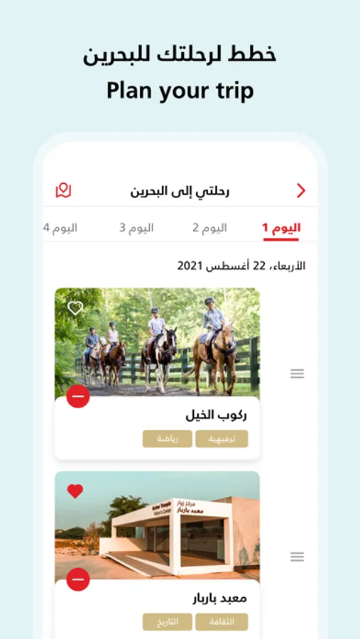 Through our App, we offer you an insight into the various events and activities taking place in Bahrain. We also highlight tourist spots, points of interests, and shopping destinations. Users will be able to create and plan their trips through adding places and events listed into a personal itinerary.