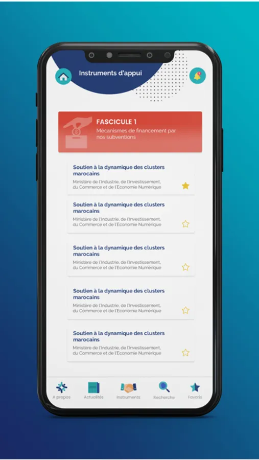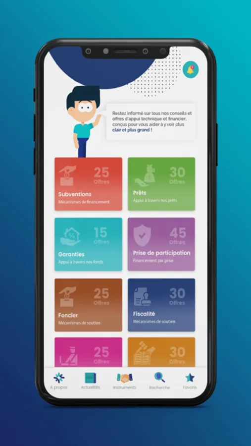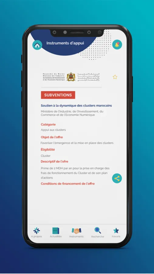 L’application Al Moukawala, vous informe de toutes les opportunités entrepreneuriales, grâce à une Identification rapide et simplifiée, que vous soyez une TPE, une PME, un porteur de projet, une startup, une personne physique, un auto-entrepreneur ou un exploitant agricole … Vous trouverez toutes les natures d’offres qui correspondent à votre besoin : subvention, garanties, prêt, facilitation douanière, prise de participation etc …