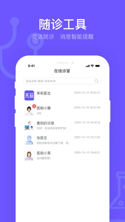 诊后随访:医生可方便地对就诊患者进行诊后随访服务,随时随地进行用药指导,并获取用户康复进程。