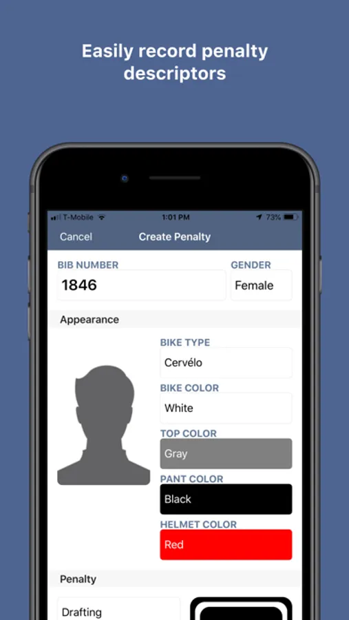 - Document optional penalty details such as: gender, bike type, bike color, top color, pant color, helmet color, penalty, mile location of infraction, miscellaneous notes and photo option in order to submit penalty