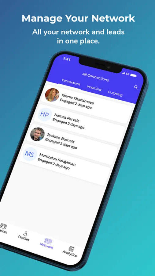 All of your network and leads are available in one place. Easily view contact information for those who have connected with you, call and e-mail them from the app, save notes and more.