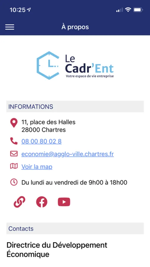 De plus, Chartres métropole a ouvert en plein centre-ville, un tiers-lieu économique ayant pour ambition d'être un véritable espace d'accompagnement pour les entreprises locales et la vitrine économique du territoire. Le Cadr’Ent est situé au 11 place des Halles à Chartres (ancien grenier à sel), à côté du pôle administratif. Cet espace, à l'ambiance moderne et dynamique, offre aux entreprises plusieurs services : Un point de rencontre avec les équipes du Développement Économique de Chartres métropole, un espace nomade pour se poser entre deux rendez-vous, 3 bureaux pour travailler à la demi-journée ou à la journée, 1 salle de réunion pour 6 personnes pour accueillir des clients ou prospects et leur montrer le dynamisme du territoire et un lieu d'animations économique et d'expositions destinées à la mise en valeur des savoir-faire locaux. Cette application mobile permet d’accéder plus facilement à l’ensemble des services présents dans ce tiers-lieu.