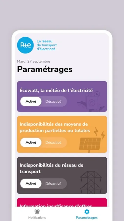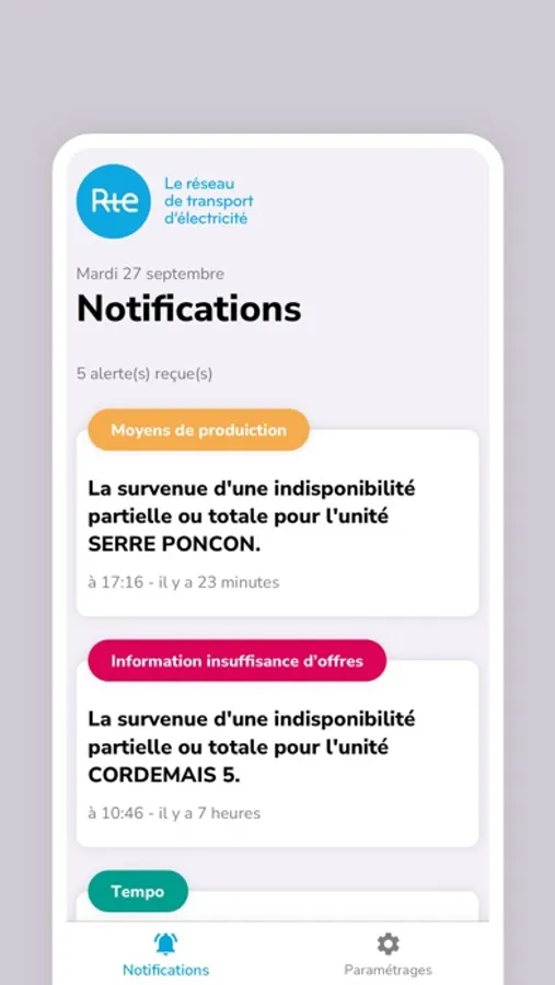 En complément du service mail de notifications du Portail Services, RTE propose cette application pour vous permettre de recevoir en temps réel sur votre smartphone les alertes suivantes :