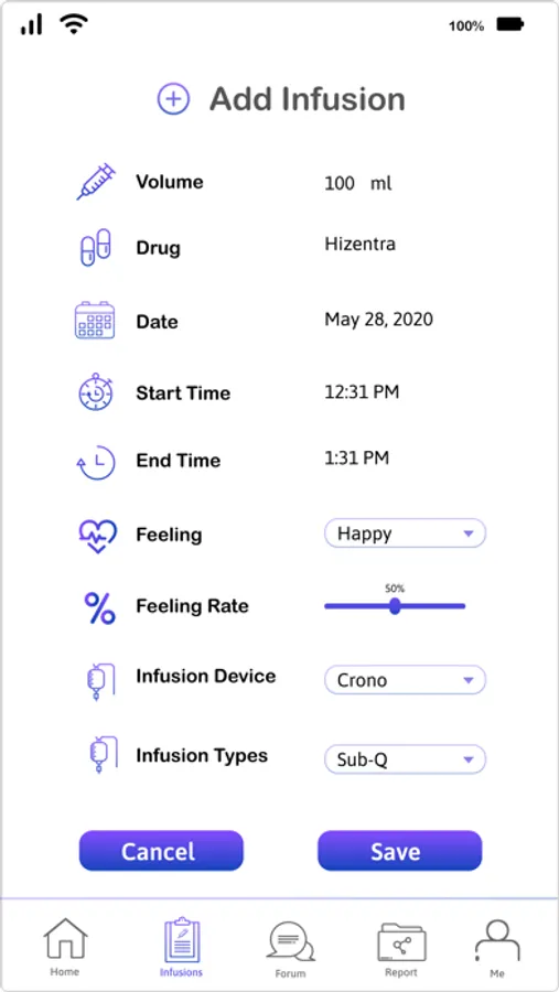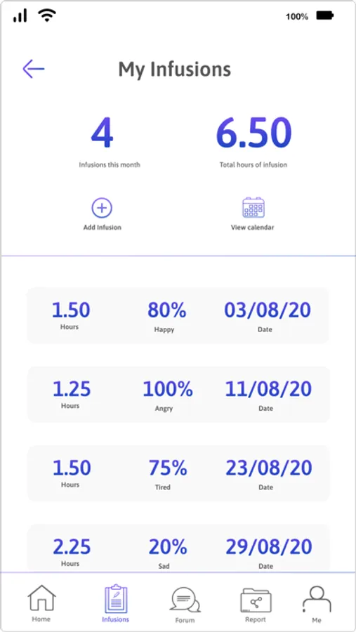 Infusion Care is a state of the art and intuitive app that uses the Health App and it is designed to help optimize your infusions and take charge of your therapy. Track, schedule, and adhere to your infusions with maximum precision with information such as the date, amount, duration, and even how you were feeling afterwards. Get analytics about your total infusion times and when you infuse best.