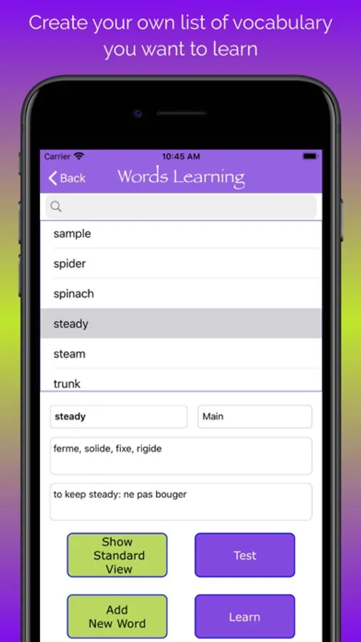You can use this App in two ways, either by taking existing lessons or by creating your own list of words and vocabulary by adding them with their translation or definition.