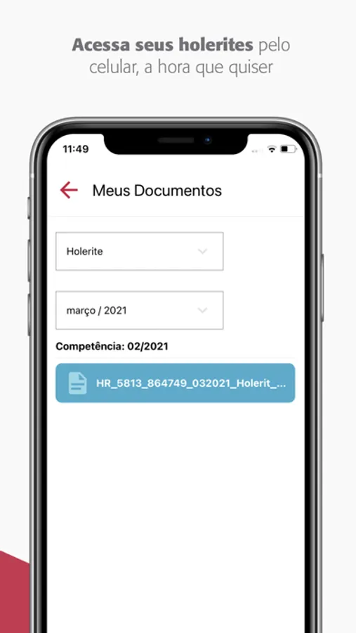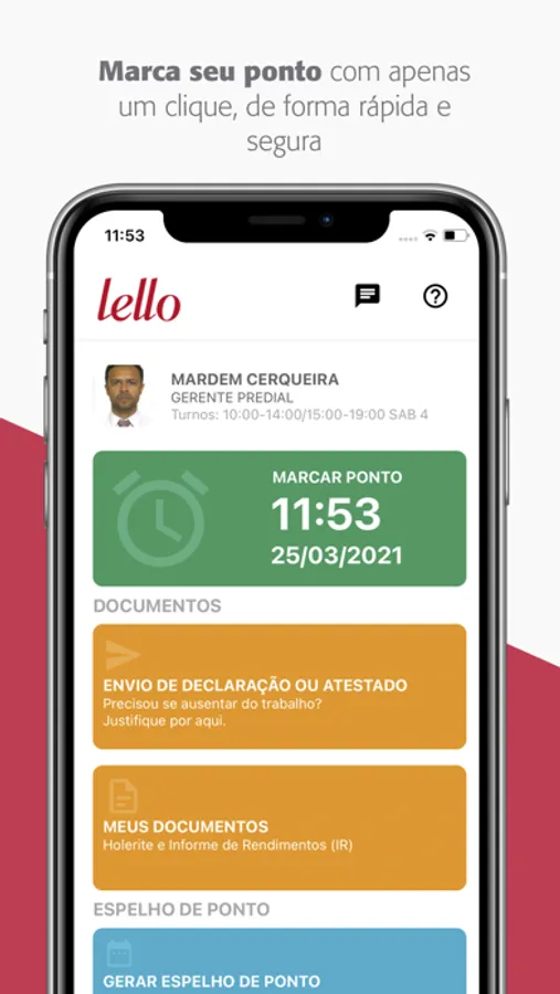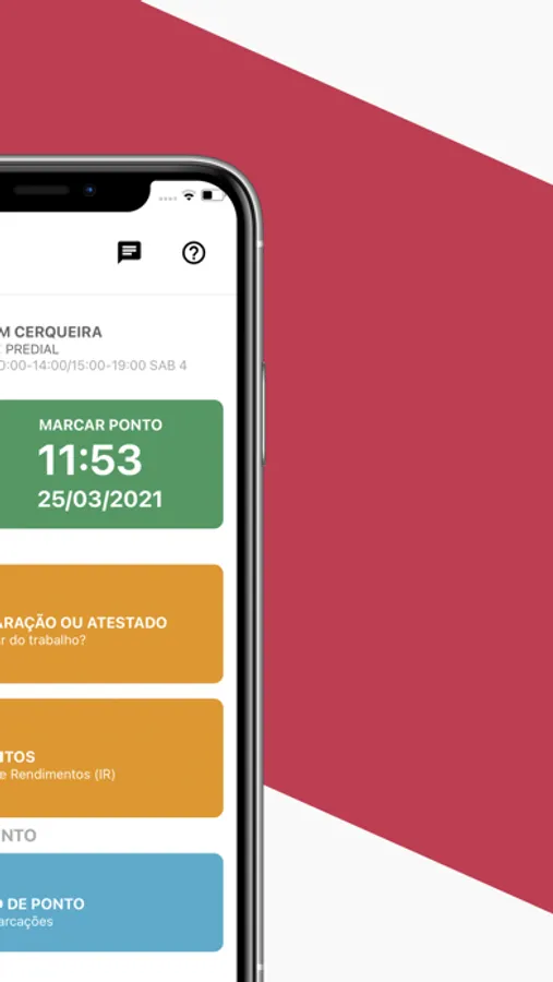 lugar, na palma da sua mão. Você pode marcar o seu ponto, consultar seu holerite, o seu informe de rendimentos para imposto de renda, enviar atestados e muito mais! Tudo num único lugar de um jeito muito simples.