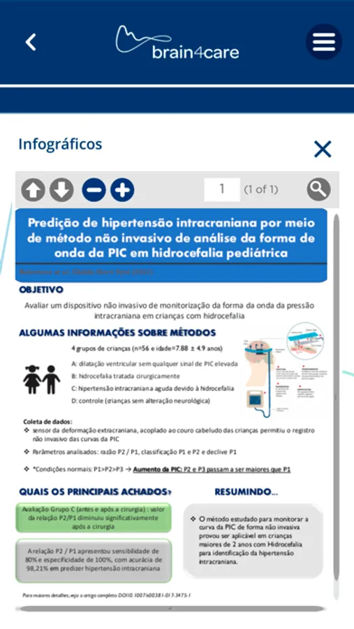 A brain4care é uma startup brasileira, fundada em 2014, que nasceu a partir do desenvolvimento de uma tecnologia pioneira no mundo capaz de identificar alterações de pressão e complacência intracraniana por meio da morfologia do pulso da pressão intracraniana (curva da PIC) e sua tendência ao longo do tempo, de maneira totalmente não invasiva. O propósito da brain4care é desafiar os limites da medicina para vivenciar histórias de saúde e felicidade. Sua missão é reduzir a dor e o sofrimento de milhões de pessoas estabelecendo um novo sinal vital, acessível a todos e em qualquer lugar. O objetivo deste aplicativo é difundir o conhecimento e contribuir para educação continuada dos profissionais de saúde, tendo como objetivo principal a qualidade do cuidado prestado ao paciente.