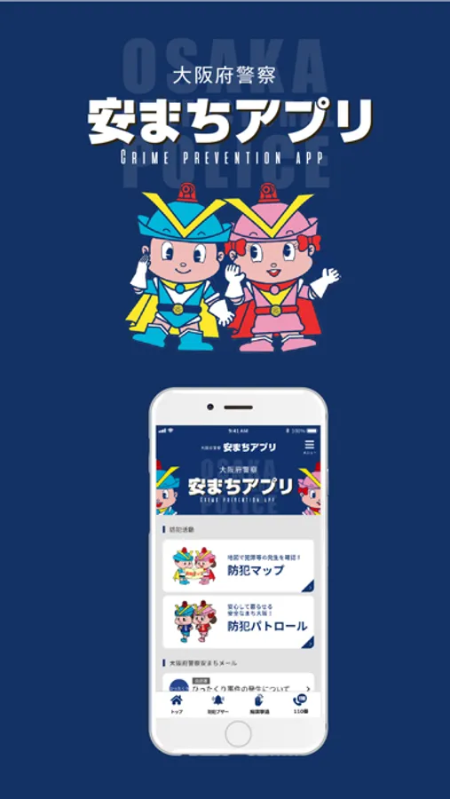 「安まちアプリ」は、大阪府警察から大阪府内の犯罪発生情報や防犯対策情報等をお届けする防犯アプリです。