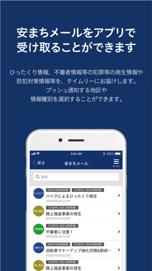 ひったくり情報、不審者情報等の犯罪等の発生情報や防犯対策情報等をタイムリーに受け取ることができます。