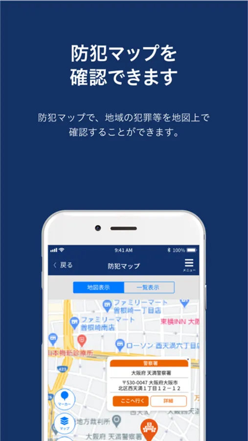 防犯マップで、地域の犯罪等を地図上で確認することができます。