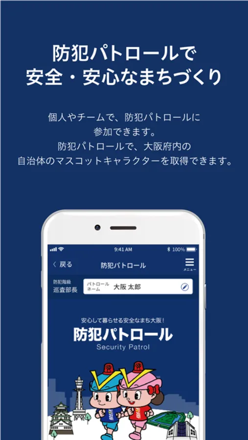 個人やチームで防犯パトロールに参加することができ、活動した結果を記録することができます。