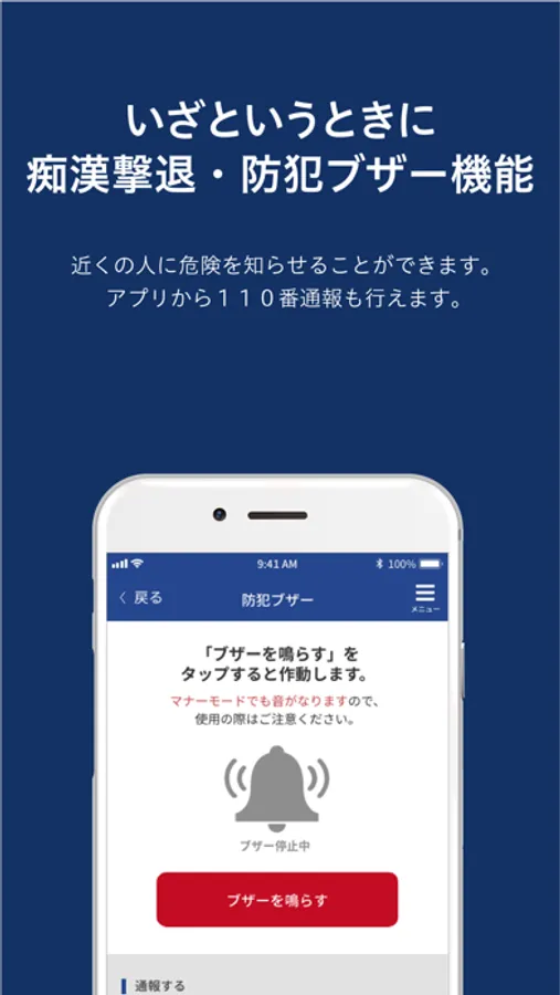 ブザーの起動と同時に、あらかじめ登録したメールアドレスに位置情報付きで知らせることができ、専用ボタンで110番通報も可能です。