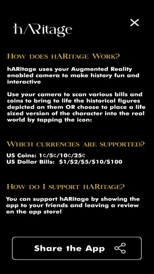 hARitage uses your phone's camera to bring Historical Figures to life with the power of Augmented Reality! Scan US dollar bills or place historical figures manually to hear famous speeches and quotes from American History!