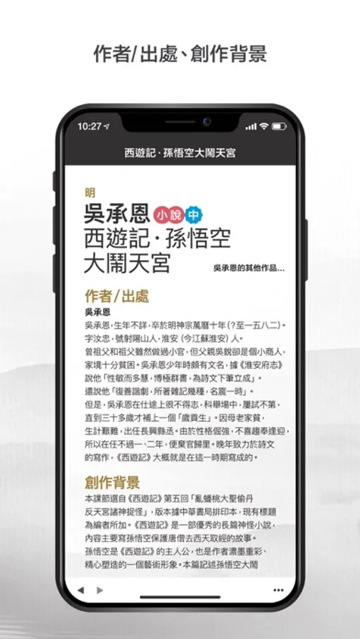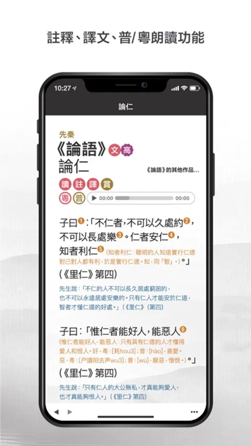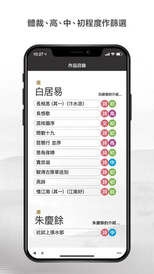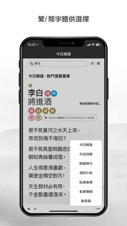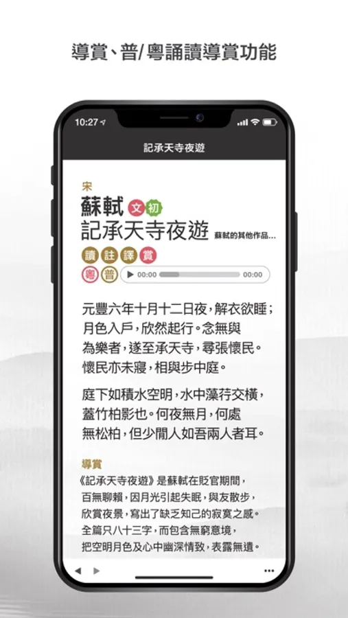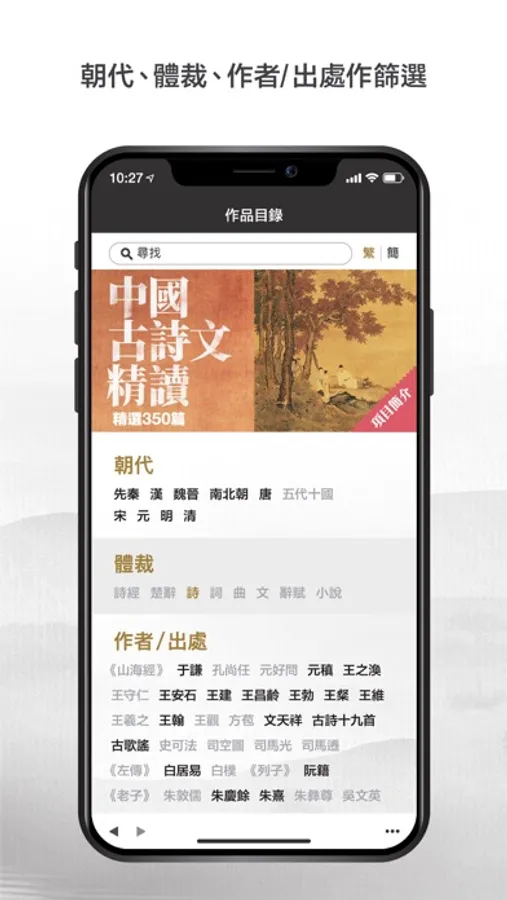 精選350篇古詩文,配以朗讀(普/粵)、註釋、譯文、導賞、創作背景、作者介紹、繁/簡字體,部分作品提供英譯。由先秦至晚清,從不同體裁:詩經、古詩、諸子百家、楚辭、辭賦、唐宋古文、唐詩、宋詞、元曲及小說等,篩選中華文化歷代最重要的資產。