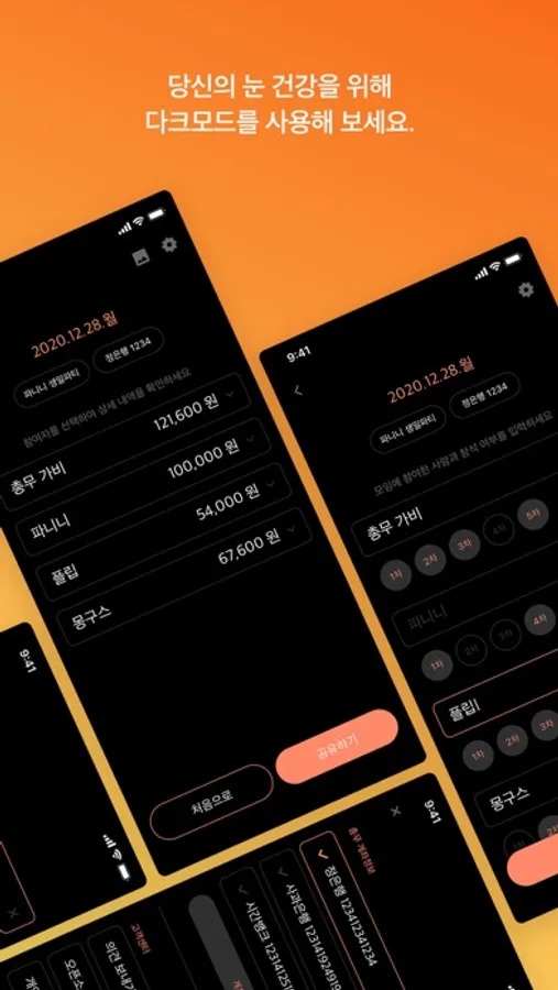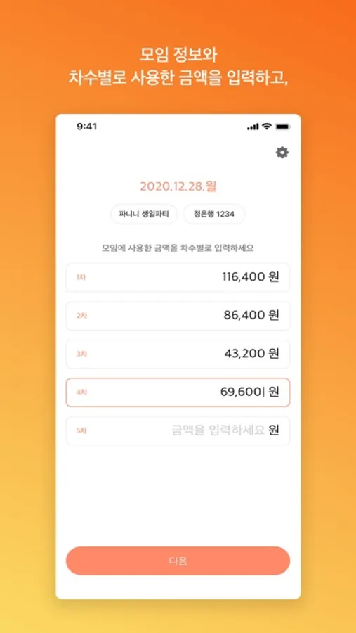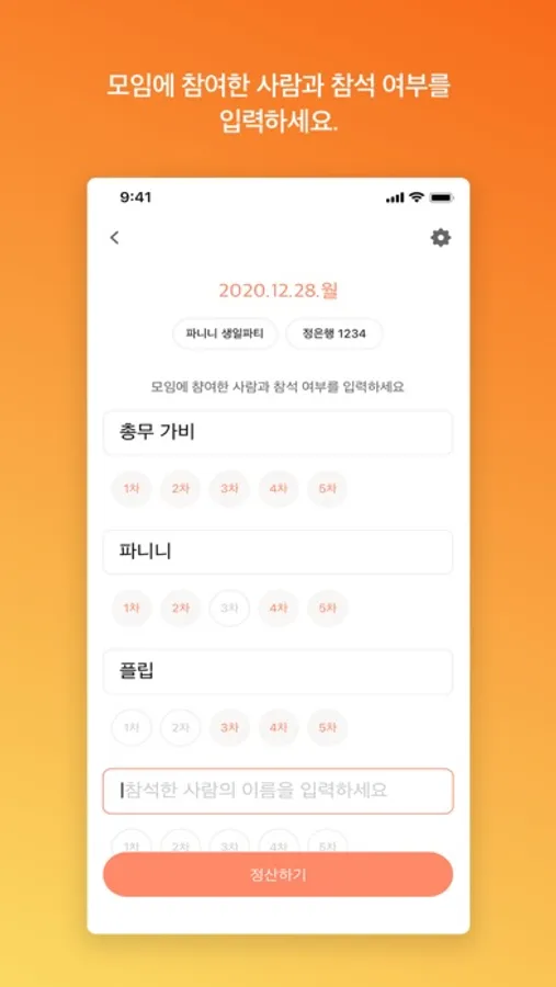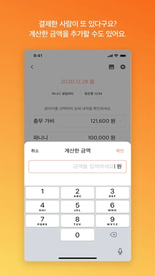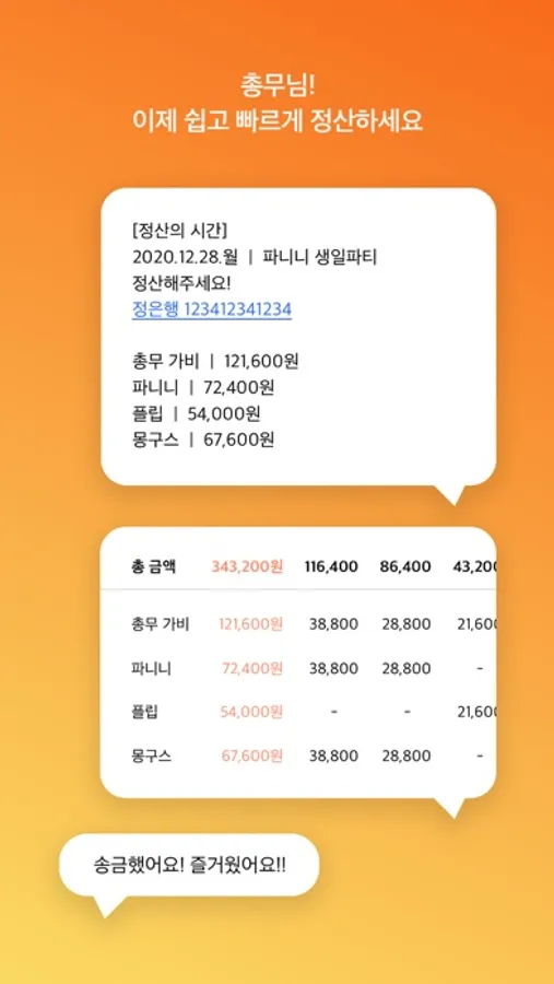 - 총무 외에 계산한 사람이 있을 경우 계산한 금액 추가하여 정확한 정산
