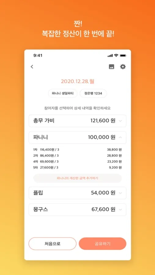 - 공유 버튼을 선택 시 정산내역, 상세내역, 총무계좌정보 공유 가능