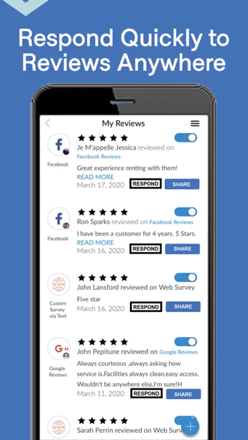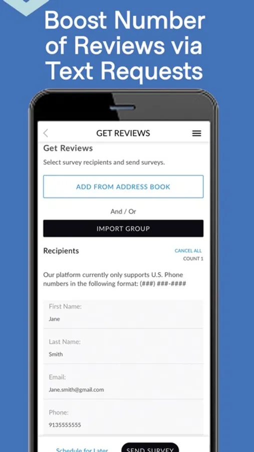 Get more customer reviews via text and email and automatically have them shared to your connected social channels.