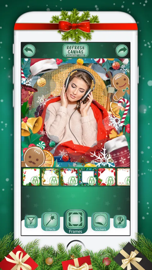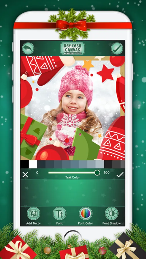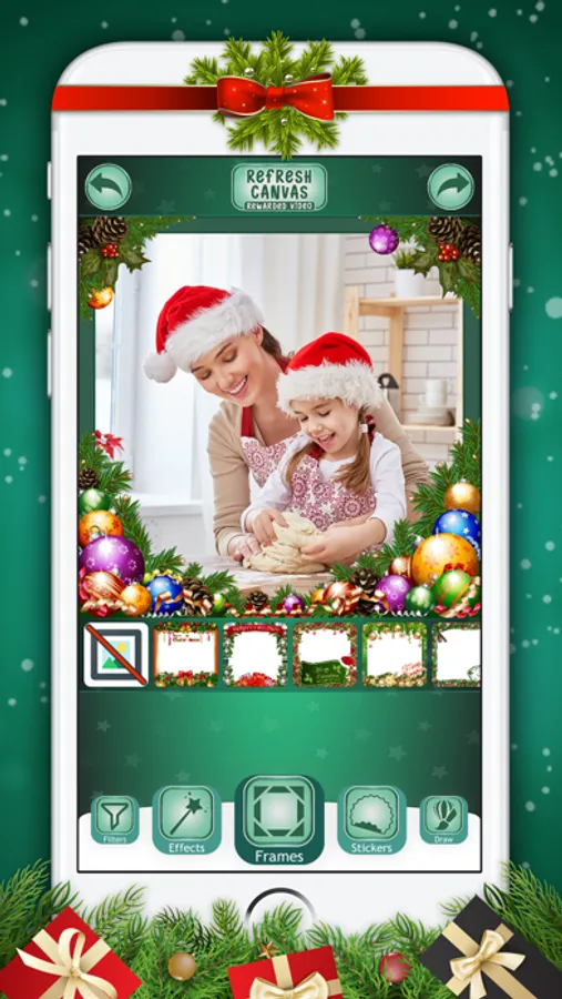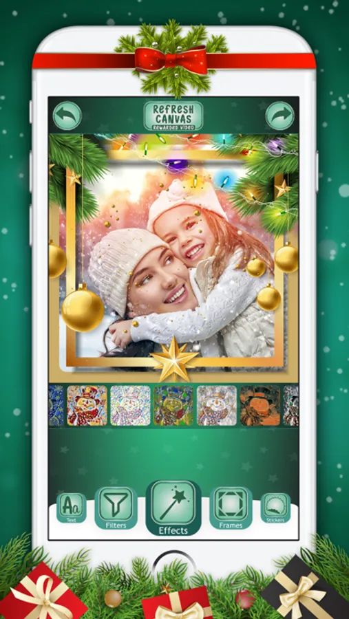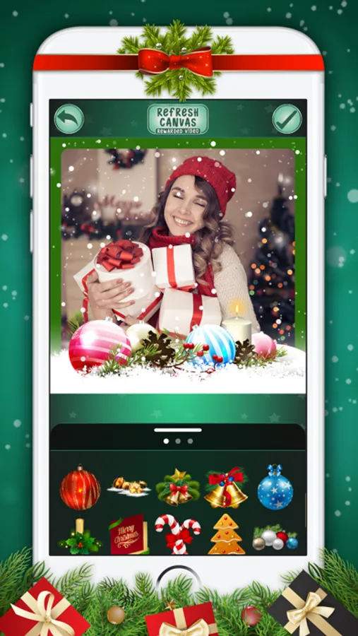 If you love “Merry Christmas photo frames", you will certainly fall in love with all these Christmas decorations you can put on your pics. Take selfies and pics of your friends and family and start adding Christmas tree ornaments, snowflakes, bells, a mistletoe, snowman, Santa cap or beautiful presents. Then when you finish photo editing, share the pic or selfie with your friends and followers and become instantly popular on social networks.